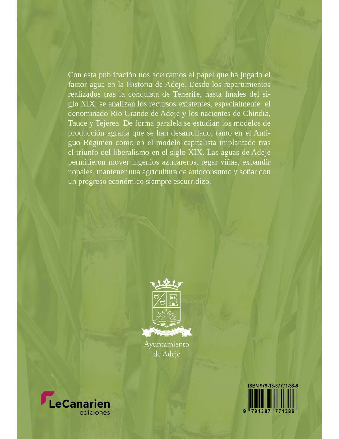 Con esta publicación nos acercamos al papel que ha jugado el factor agua en la historia de Adeje. Desde los repartimientos realizados tras la conquista de Tenerife, hasta finales del siglo XIX, se analizan los recursos existentes, especialmente el denominado Río Grande de Adeje y los nacientes de Chindia, Tauce y Tejerea.